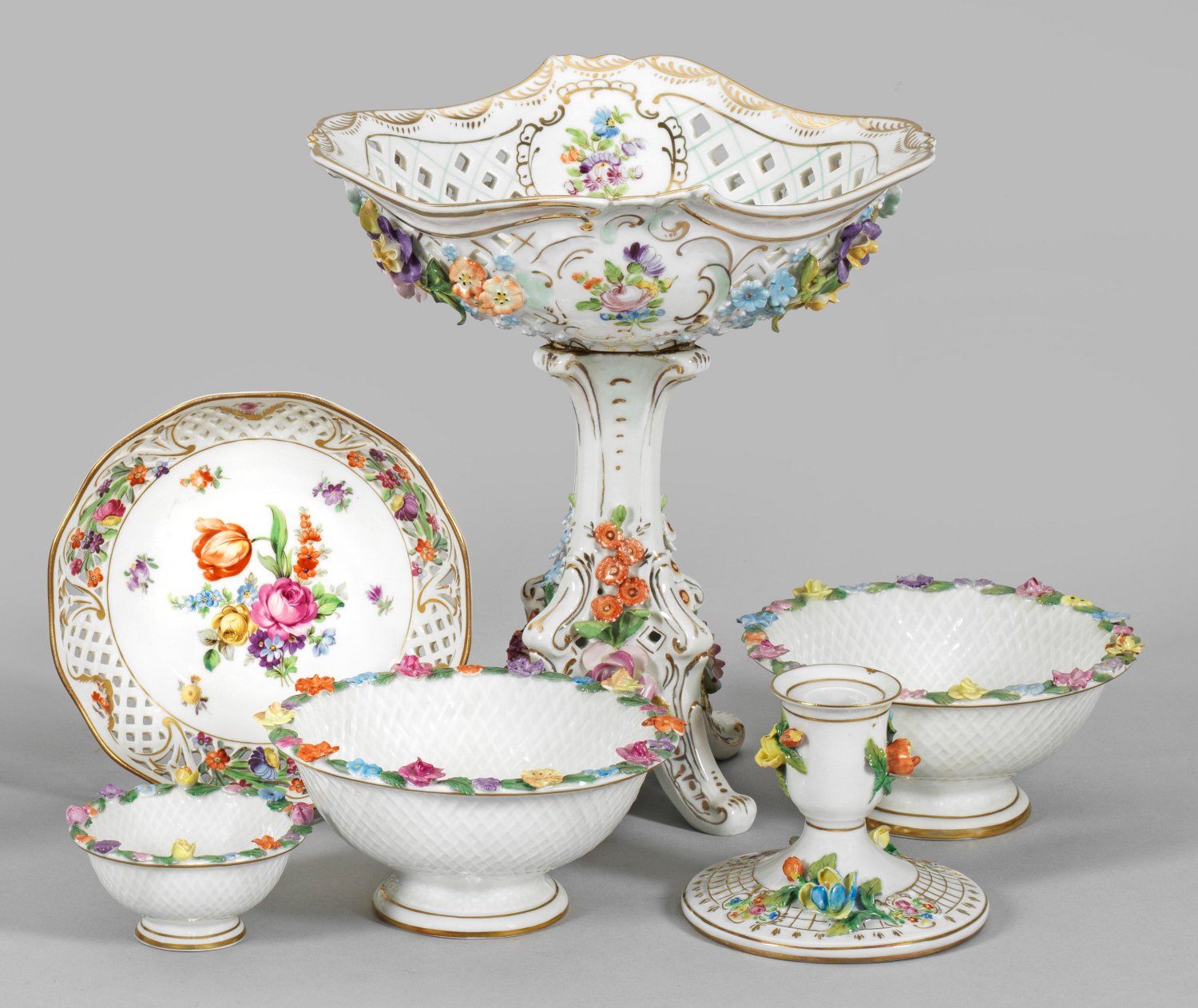 5-tlg.; Aufsatzschale und 3 Zierschalen, Kerzenhalter. Teilw. Gitterwerk- bzw. Blütenrelief. Plastisch aufgelegter Blumenrankendekor sowie polychrome Blumenmalerei. Goldstaffage. Teilw. minim. best.; Manufakturmarke. Beigabe: Durchbrochen gearbeitetes Schälchen mit Blumendekor, Schumann Dresden. H. 4,5 cm - 26,5 cm.
