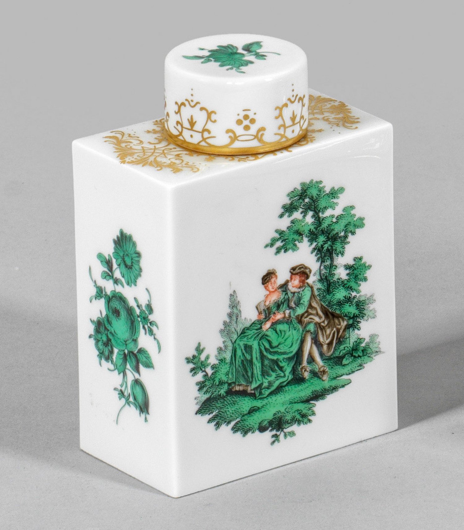 Hochrechteckiger Korpus mit übergreifendem Runddeckel. Beidseitig der Wandung szenische Darstellungen von Watteaufiguren in baumbestandener Parklandschaft, auf den Schmalseiten feine Blumenbuketts. Kupfergrüne Camaieu- sowie dezente polychrome Malerei. Auf der flachen Schulter und am Deckel feinliniger Goldrankendekor. Schwertermarke. H. 10 cm.