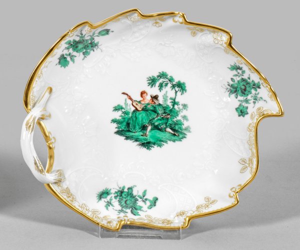 in Form eines Blattes mit gezacktem Rand und Asthenkel. Reliefdekor "Marseille". Im leicht vertieften Spiegel szenische Darstellung mit sog. Watteaufiguren, umgeben von Blumengebinden in kupfergrüner Camaieumalerei. Umlaufend florale Goldbordüre mit Zahnkante. Schwertermarke. 19 cm x 17 cm.