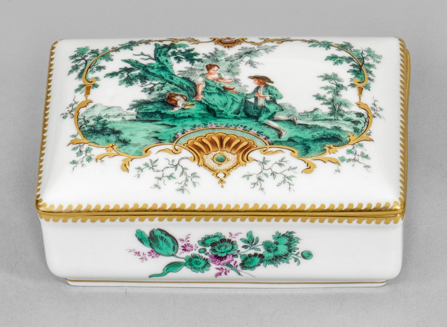 Rechteckige Form. Auf dem leicht gewölbten Deckel großflächige, von goldener Rocaillerahmung umzogene, szenische Darstellung, sog. Watteaufiguren. Die Wandung mit feinen Blumengebinden. Kupfergrüne und purpurfarbene Camaieu- sowie dezente polychrome Malerei. Umlaufende Goldbordüre als Zahnkante. Schwertermarke. H. 5 cm. 12 cm x 9 cm.