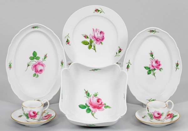 16-tlg.; 11 Speiseteller, 2 Anbietplatten, Beilagenschale, 2 Mokkatassen mit Untertassen. Rosendekor in polychromer Malerei. Teilw. best./Gebrauchsspuren. Brandfleck. Schwertermarke. Plattenmaß 28,5 cm x 20,5 cm.