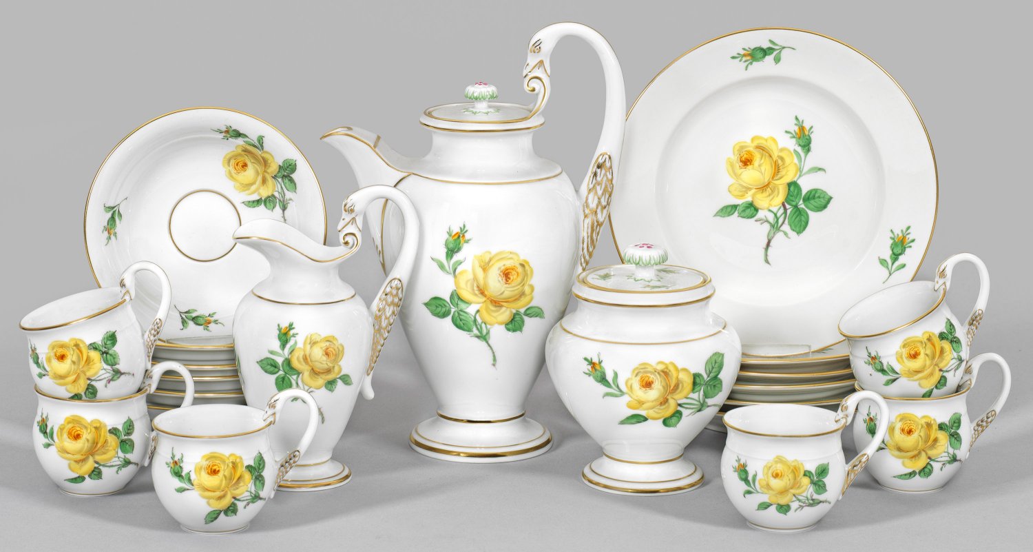 A 15-piece porcelain mocha set with "Yellow rose" decor. Crossed swords mark.