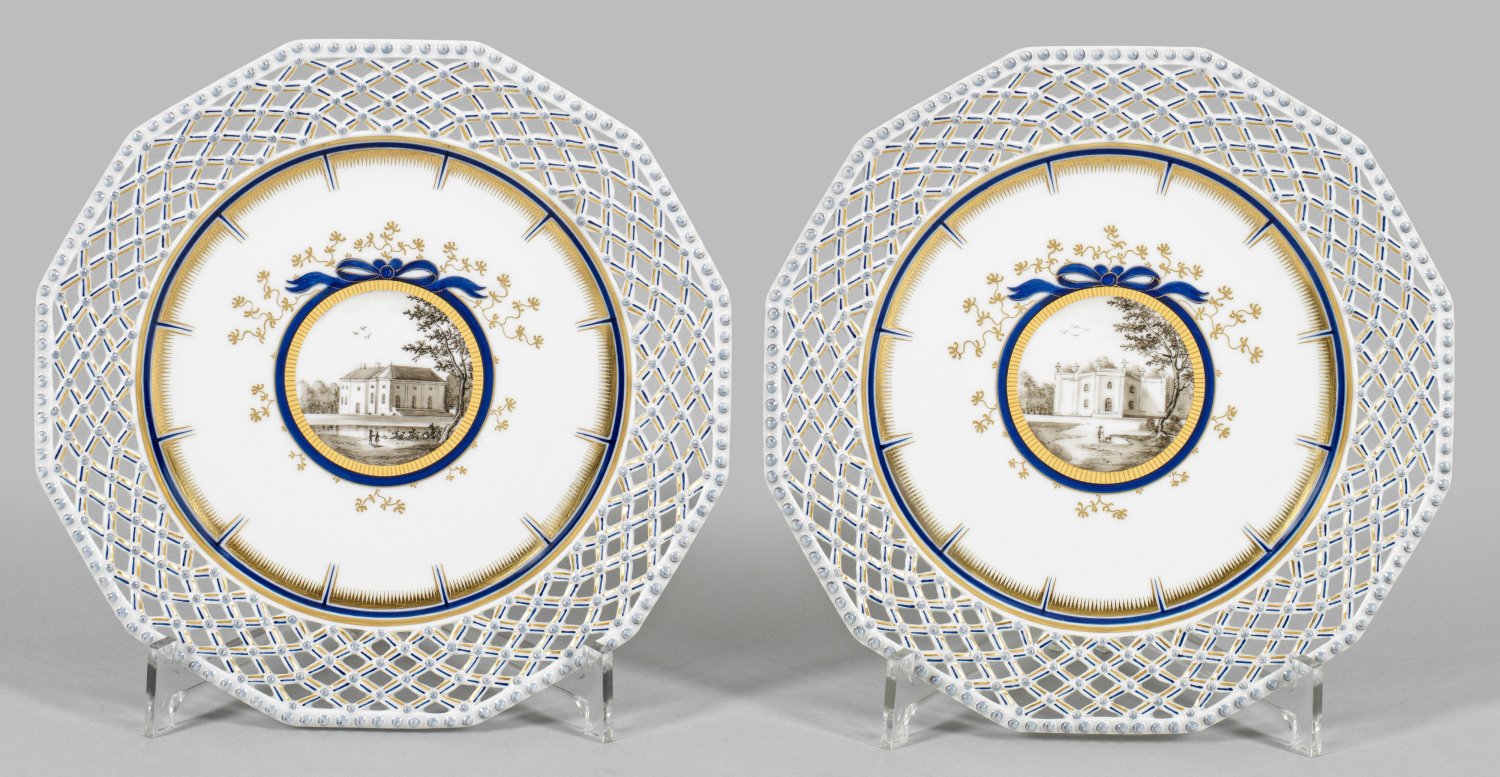 Zwölfeckige Form mit reliefiertem Perlfries und gitterförmig durchbrochen gearbeiteter Fahne. Im leicht vertieften Spiegel blau-gold gerahmtes Schleifenmedaillon mit Ansichten der Pagodenburg bzw. Badenburg des Nymphenburger Schlossgartens in Grisaillemalerei. Manufakturmarke. D. 23 cm.