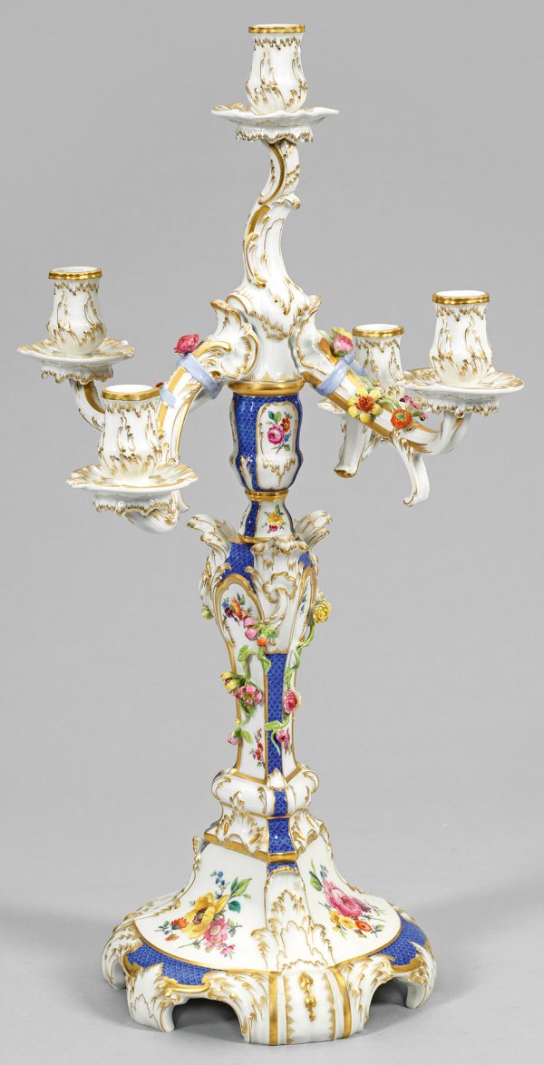 5-flg.; Von Blattvoluten getragener, hochgezogener Rundfuß, in dreiseitig gekanteten, mehrfach gegliederten Balusterschaft übergehend. Davon ausgehend fünf geschwungene Leuchterarme mit blattreliefierten Tüllen über tellerartiger Traufschale. Umlaufend reicher, rocailleförmiger Reliefdekor sowie plastisch aufgelegte Blütenranken. Auf der Wandung, in goldkonturierten Reserven, gerahmte, farbenprächtige Blumenbuketts und -gebinde im Wechsel mit Fondfeldern aus blauem Schuppenmosaik. Feine polychrome Malerei mit reicher Goldstaffage. Zepter- und Malereimarke. H. 61 cm.