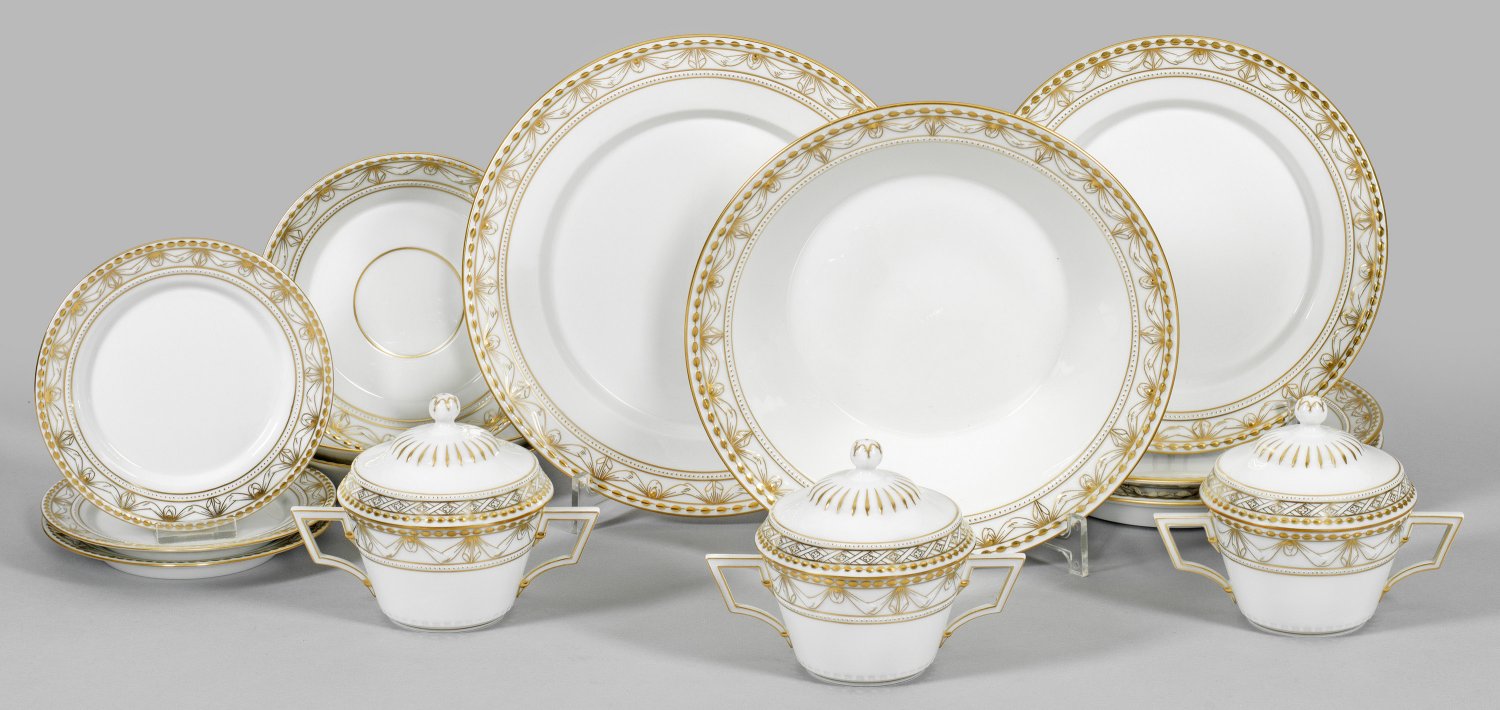 11-tlg.; 3 Suppentassen mit Untertassen, 3 Brotteller, 3 Vorspeisen- und ein Speiseteller, Beilagenschale. Klassizistische Form mit Reliefbordüren aus wiederkehrendem Tuchgehänge und Kreuzband. Weißporzellan mit Goldstaffage. Zepter- und Malereimarke. Suppentassen-H. 11,5 cm. D. 10 cm - 26 cm.