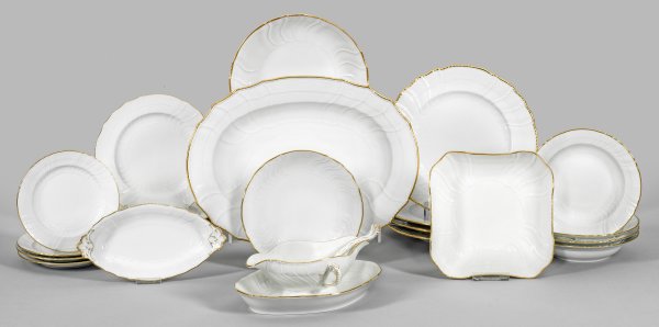 23-tlg.; 4 Speise-, 4 Suppen-, 4 Brot- und 4 Kuchenteller, Bratenplatte, Sauciere mit Löffel, 2 Anbietschalen, Gebäck- und Konfektschale. Reliefdekor "Neuosier" mit Goldrand. Zepter- und grüne Malereimarke. Platten-L. 40 cm. Schalen-D. 20 cm - 24,5 cm.
