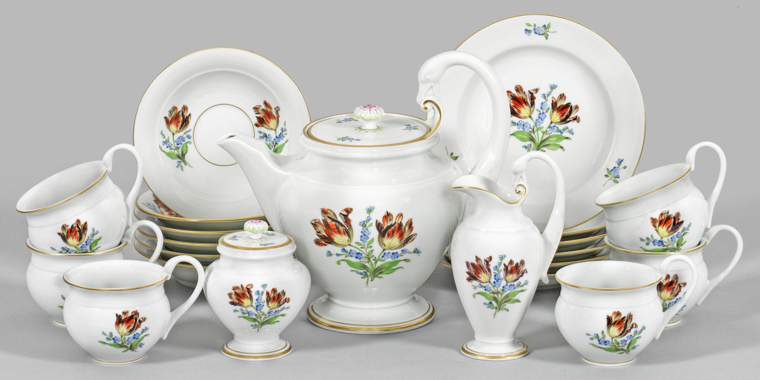 15-tlg.; Teekanne, Zuckerdose, Milchkännchen, 6 Teetassen mit Untertassen und 6 Kuchenteller. Empireform mit hochgezogenen Schwanenhalshenkeln. Auf der Wandung und im Spiegel mit prächtigen Tulpen in Marcolini-Malweise. Polychrome Malerei. Goldrand. Schwertermarke.