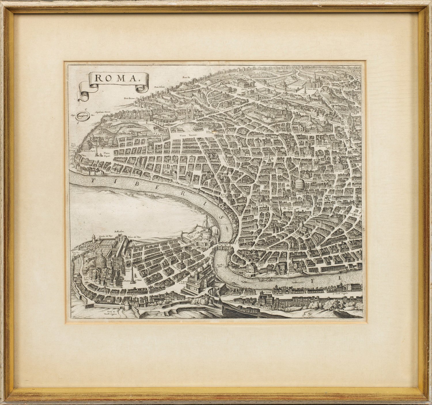 Kupferstich/Papier. 1 von 2 Platten der Gesamtansicht Roms aus der Vogelschau, erschienen in der "Topographia Italiae". Mittig kleine Fehlstelle. Plattenmaß ca. 31 x 36 cm. Rahmen.