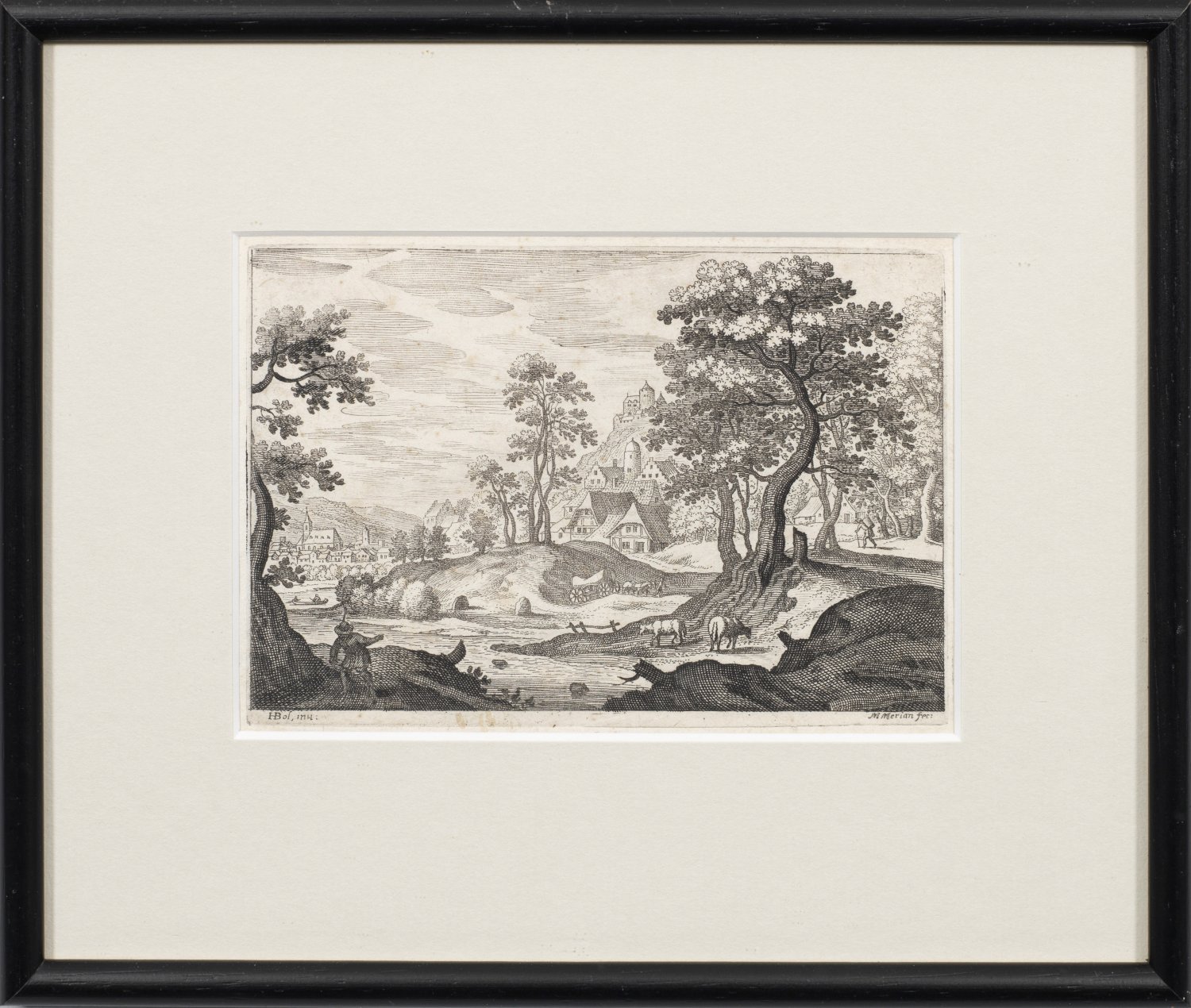 Two engraved landscapes and one harbour view by Matthäus Merian, circa 1620.