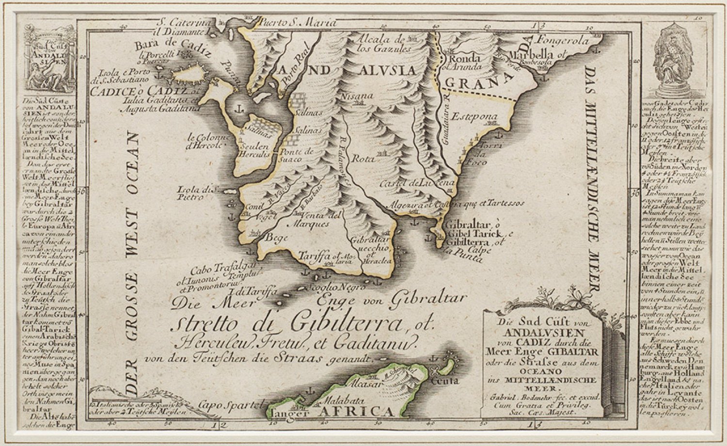 A copper-engraved map of Southern Andalusia with the Strait of Gibraltar by Gabriel Bodenehr, published in Augsburg, ca. 1704-1720.