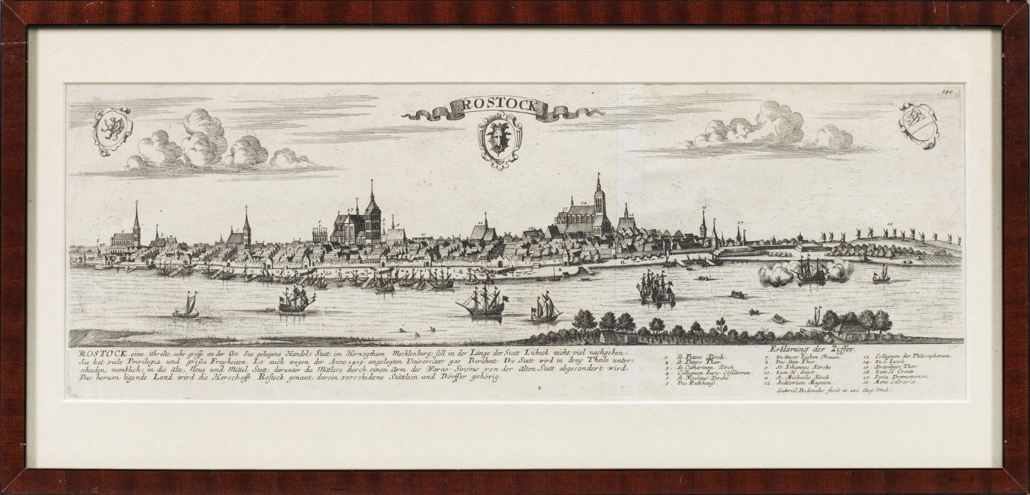 Kupferstich/Papier, um 1720. Aus "Europens Pracht und Macht in 200 Kupfer-Stücken". Mittig oben betitelt und mit den 3 Wappen der Stadt versehen, unterhalb ein erklärender Text mit Legende sowie darunter bez. "Gabriel Bodenehr fecit et exc. Aug. Vind". Schöne Gesamtansicht von Rostock mit Blick über die Warnow, belebt durch die Staffage von Schiffen. Plattenmaß 17 x 50 cm. Rahmen.