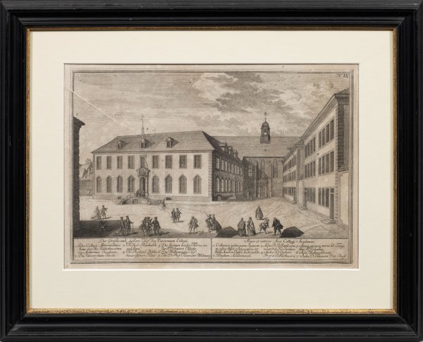 A copper engraving with an optical view of the university building in Göttingen by Georg Daniel Heumann published in 1747.