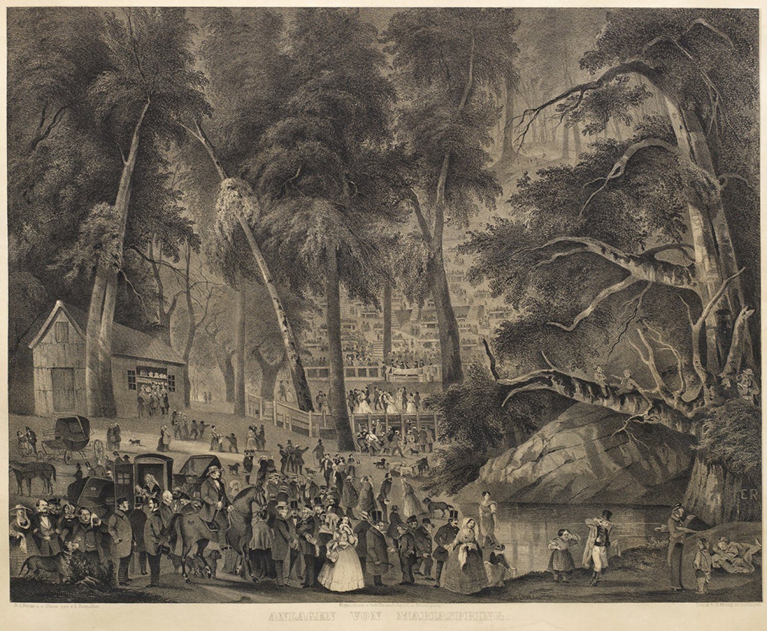 Lithograph with a view of Mariaspring near Göttingen in 1856. Signed, inscribed and titled on the stone. Accompanied by a later added card with description of the people in the foreground.
