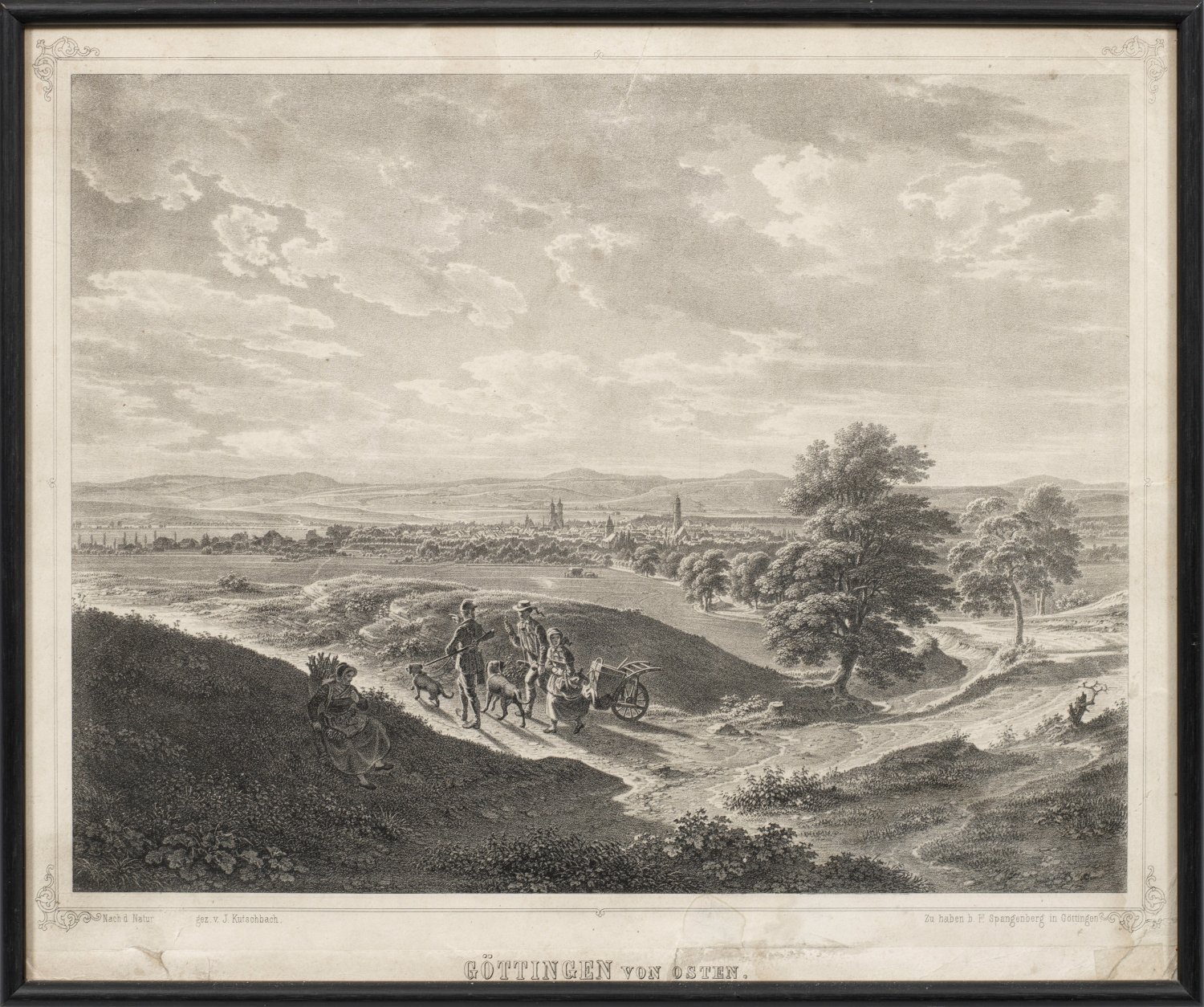 Lithographie/Papier, 1861. Detailreiche, seltene Vedute mit Blick auf Göttingen, im Vordergrund belebt durch figurative Staffage mit Reisigsammlern und einem Jäger mit seinen Hunden. Unterhalb typographisch betitelt sowie bez. "Nach d. Natur gez. v. J. Kutschbach / Zu haben b. F(riedrich). Spangenberg in Göttingen". Stellenweise Läsuren. Darstellung 23,5 cm x 30,5 cm. Rahmen.