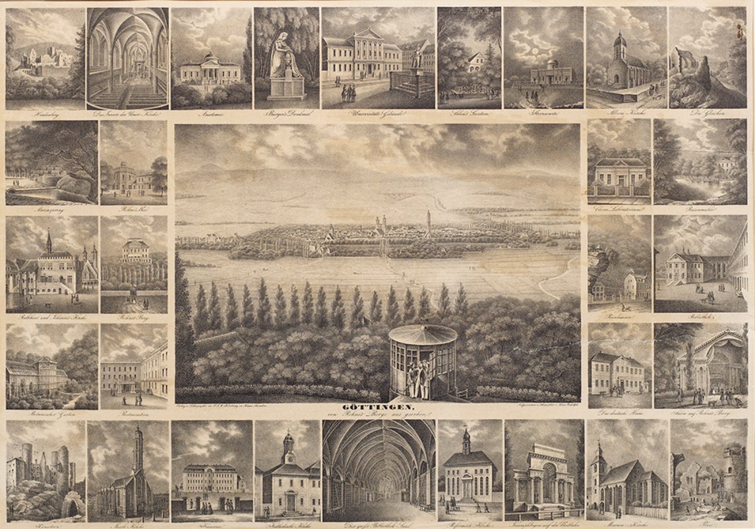 Sehr seltene Lithographie mit 40 Ansichten von Plätzen und Gebäuden in Göttingen, wie der Universität, Kirchen, Palais, Kaserne und Burgen aus der näheren Umgebung. Verlag P.T.A. Kersting in Hann.-Münden. Plattenmaß 41,5 cm x 60 cm (Passepartoutausschnitt). Rahmen.