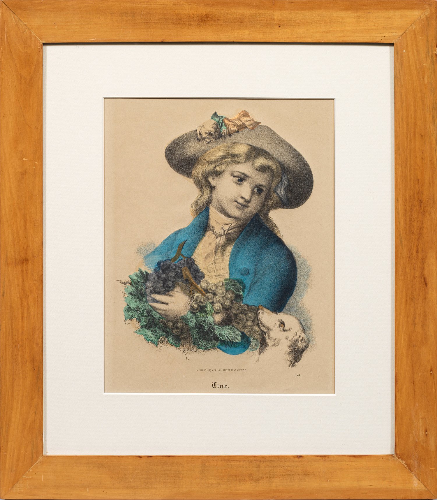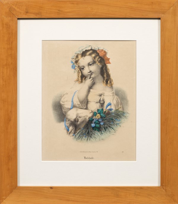 Kolorierte Lithographien/Papier, gedruckt und verlegt bei Eduard Gustav May in Frankfurt a. M., um 1870. In liebevoller Darstellung die beiden Kinder mit ihren allegorischen Begleitern, einem Schaf für die Unschuld bzw. einem Hund für die Treue. 30 cm x 23,8 cm bzw. 31 cm x 25 cm (Passepartoutausschnitte). Rahmen.