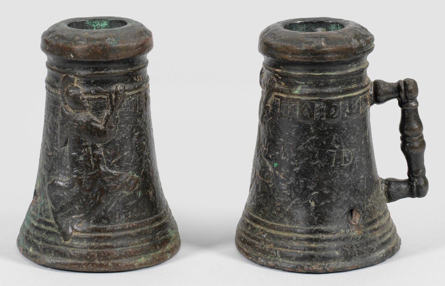 Bronzeguss. Schwere, krugähnliche Form. Erweiterter, von mehreren Profilringen gegliederter Standfuß, übergehend in glatten, sich konisch verjüngenden Korpus als Pulverkammer dienend. Ausgeprägte Mündungswulst und seitliches Zündloch. Auf der Wandung schemenhaft reliefplastisch dargestellte Männerfigur, kniend, die Hände in die Höhe streckend. Teilw. Reste einer undeutlichen Inschrift bzw. Gravur. Seitlich gekanteter, mehrfach balustierter Henkel. H. 23,5 cm.