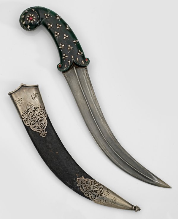 mit geschnittenem Jadegriff. Stark gebogte, zweischneidige Klinge aus Wootzdamast mit beidseitigem Mittelgrat, verstärktem Rand und Spitze. Typisch geformter, am Ansatz passig geschweifter Griff aus spinatgrüner, teilw. in Form eines lanzettförmigen Blattes geschnittener und geschliffener Jade. Einlegearbeiten aus applizierten Silberblüten und Rubincabochons und Silberfäden. Holzscheide mit schwarzem Leder bezogen und mit floral durchbrochen gearbeiteten Silberbeschlägen verziert, wohl später ergänzt. Minim. Fehlstellen. L. 43 cm.