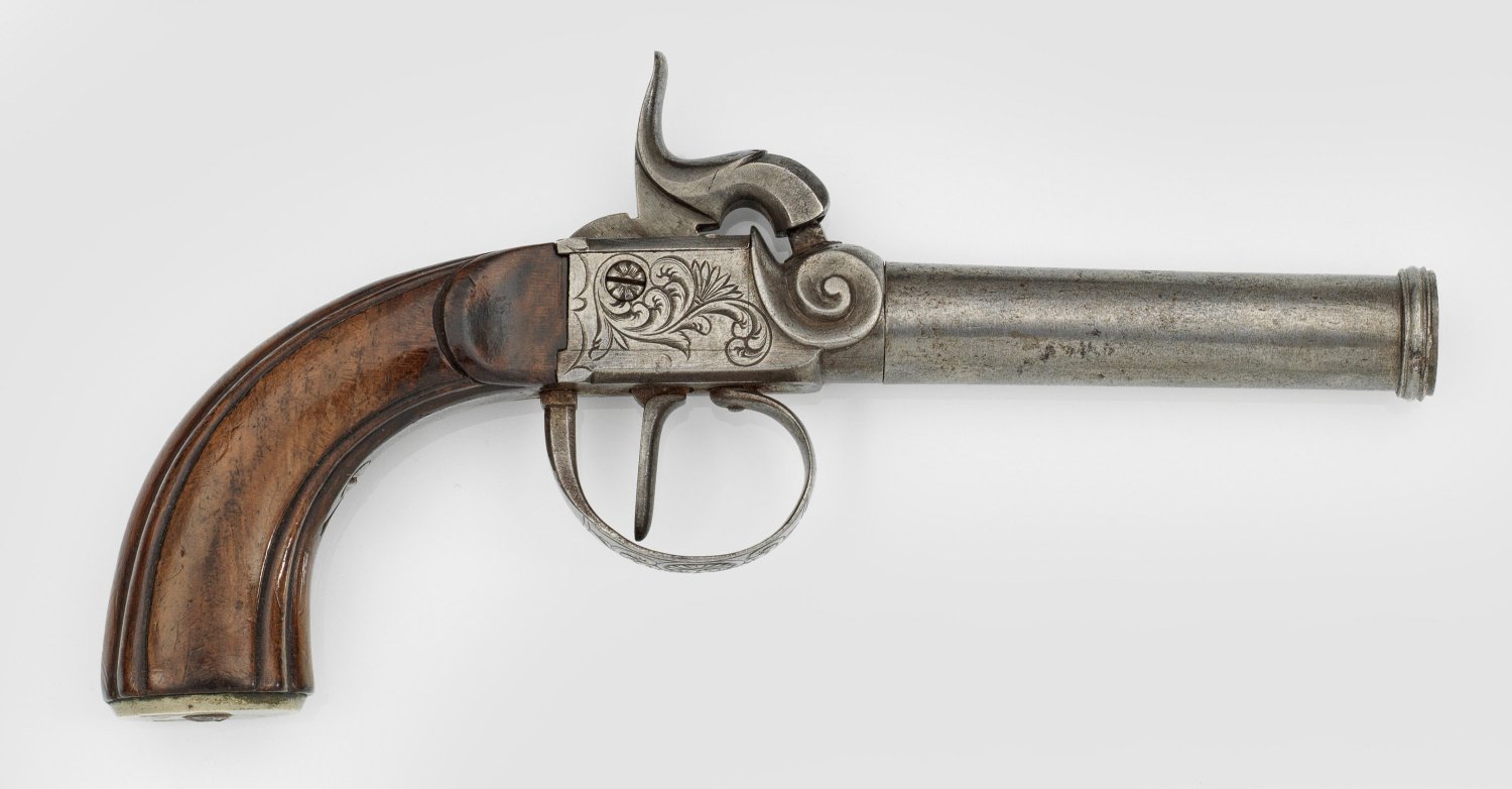 sog. Terzerol. Nussholz. Rundlauf, Kastenschloss und Hahn aus Eisen mit gravierten Ranken. Herstellergravur "Kirsch in Steyr". Von schmalen Zügen gegliederter und geschnitzter Holzkolben. Kolbenkappe wohl ergänzt. L. 19,5 cm.