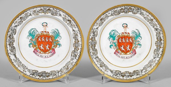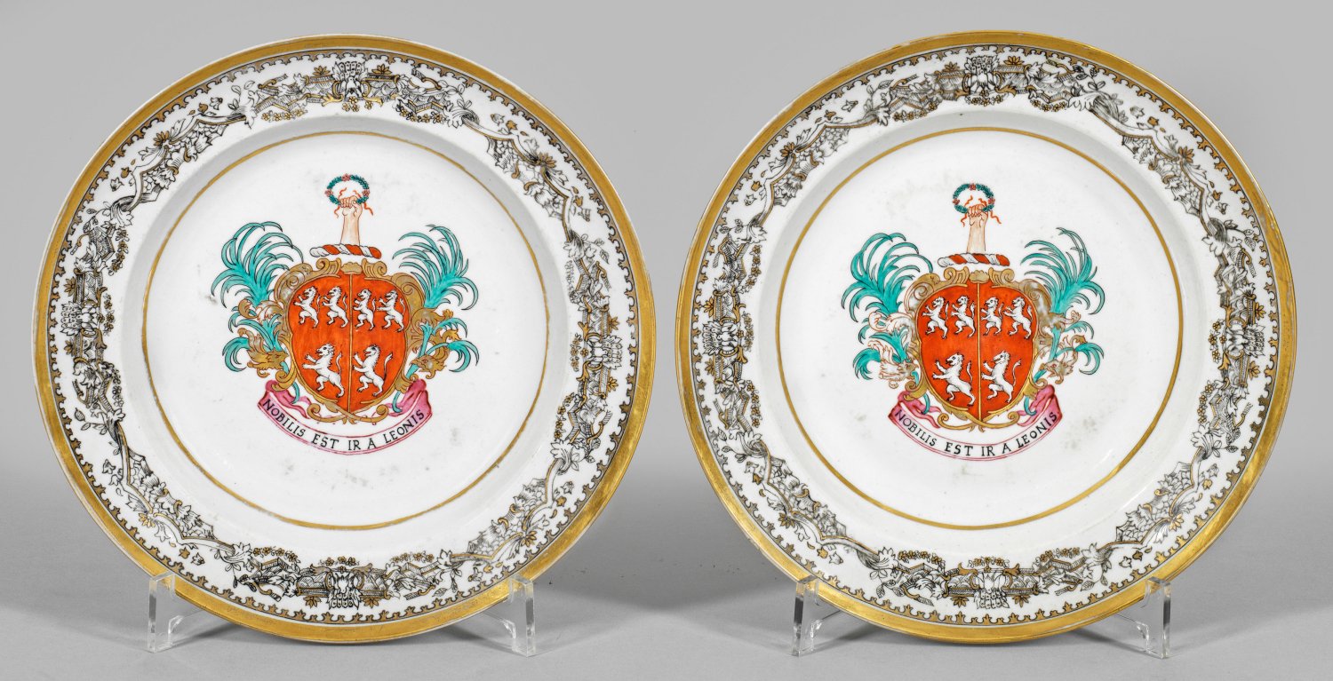 für den europäischen Markt über die Ostindien-Kompanie. Porzellan. Runde Form. Im vertieften Spiegel großes Wappen, bez. "Nobilis est ira leonis", auf der Fahne umlaufende Ornamentbodüre. Polychrome Emailmalerei mit Gold. D. 24,5 cm.