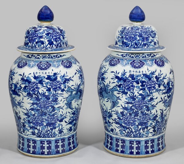 Porzellan. Balusterförmiger Korpus mit aufgewölbtem Deckel. Flächendeckender, stilisierter unterglasurblauer Dekor aus fliegendem Fenghuang-Vogel zwischen blühenden Päonienbäumen. Umlaufend breite Bordüren aus Lotusblättern, Ruyi-Köpfen und asiatischen Blüten. H. 93 cm.