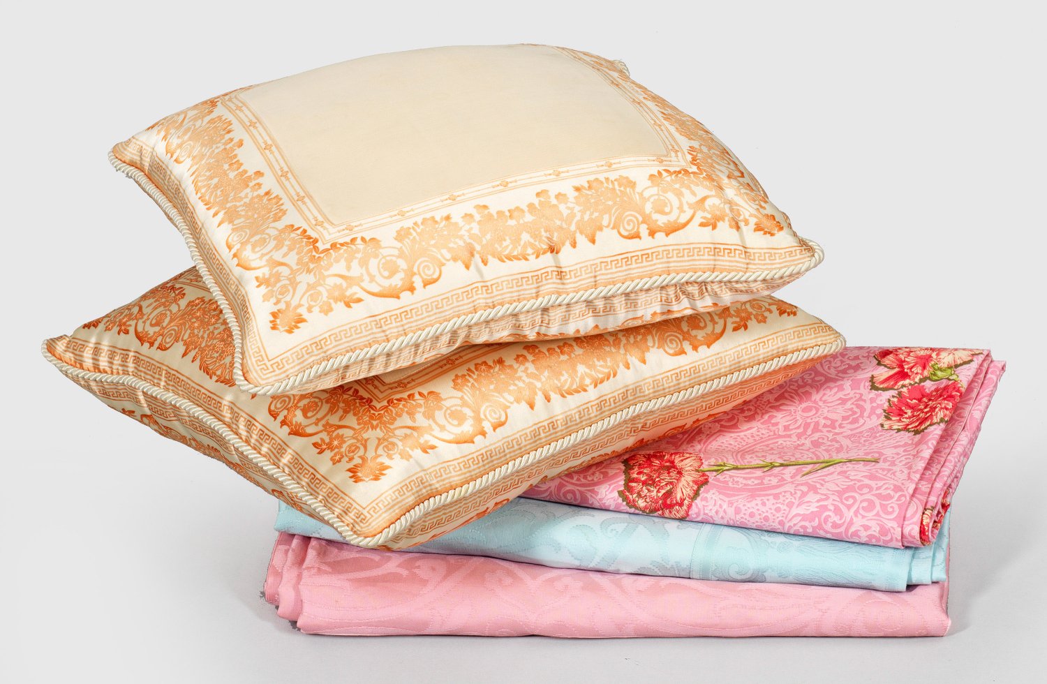 A mixed lot of two pillows and three tablecloths by VERSACE and Christian Lacroix.