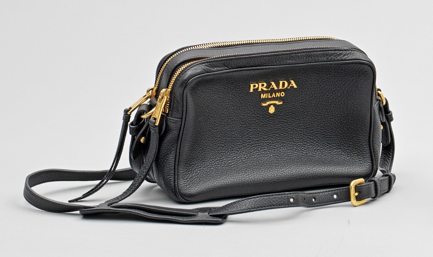 Schwarzes Leder und vergoldete Hardware. Rechteckiger Korpus mit zwei Reißverschlüssen und gerundeten Ecken. Schmaler Schulterriemen mit Schulterstück. PRADA-Schriftzug. Herstellerzeichen. Taschen-H. 14 cm. 22 cm x 8 cm.