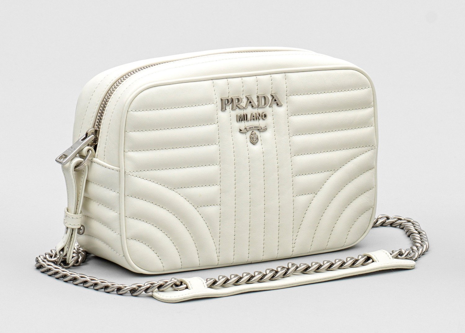 Cremeweißes Leder und silberfarbene Hardware. Rechteckiger Korpus mit Reißverschluss und gerundeten Ecken. Flächendeckende Streifensteppung. Ketten-Riemen mit Schulterstück. Innenfach mit zwei Nebenfächern. PRADA-Schriftzug. Herstellerzeichen. Taschen-H. 14 cm. 22 cm x 8 cm.