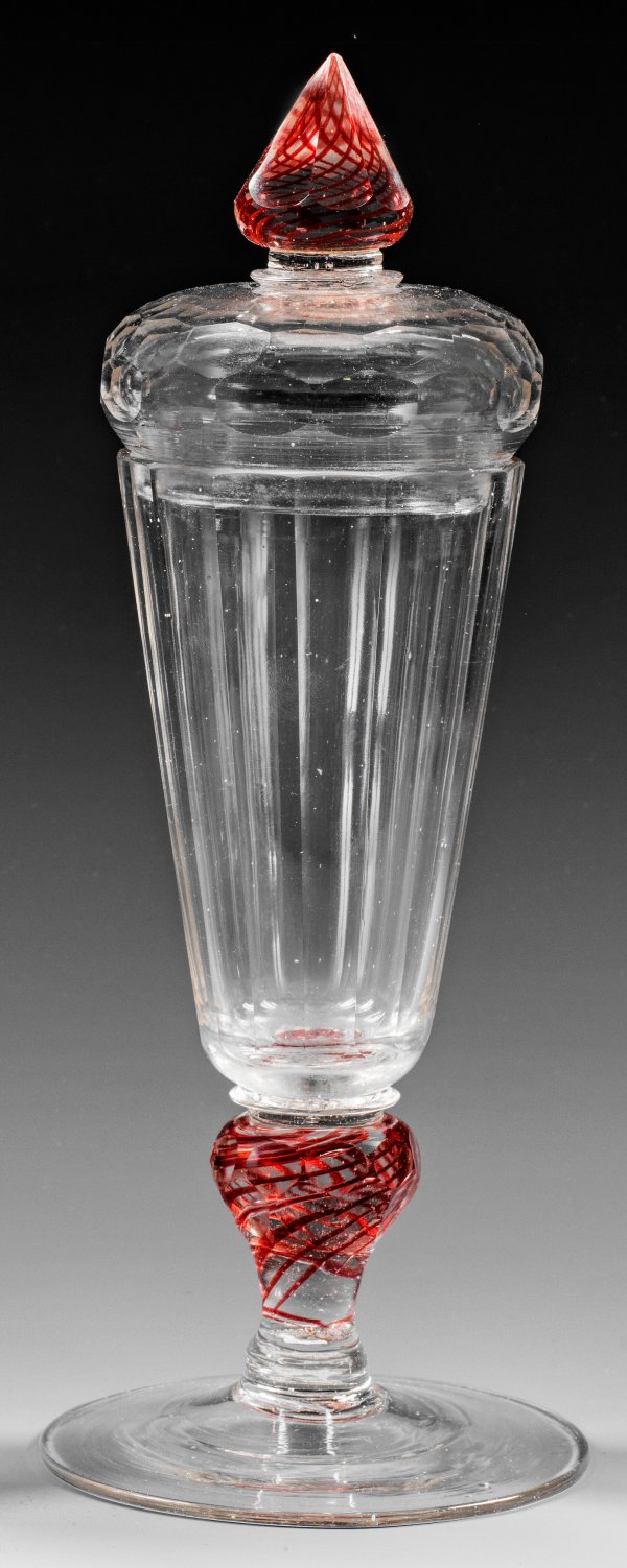Farbloses Glas, partiell geschliffen. Leicht ansteigender, weit ausgestellter Scheibenfuß, im teilw. wabenfacettierten Balusterschaft eingeschmolzene, rote Goldrubinglas-Spiralfäden. Abgesetzte, konische Kuppa mit polygonalem Facettenschälschliff. Gewölbter Haubendeckel, entsprechend dem Schaft mit Wabenfacettten, der geschälte, tropfenförmige Knauf ebenfalls mit Goldrubin-Spiralfäden. H. 28,5 cm.