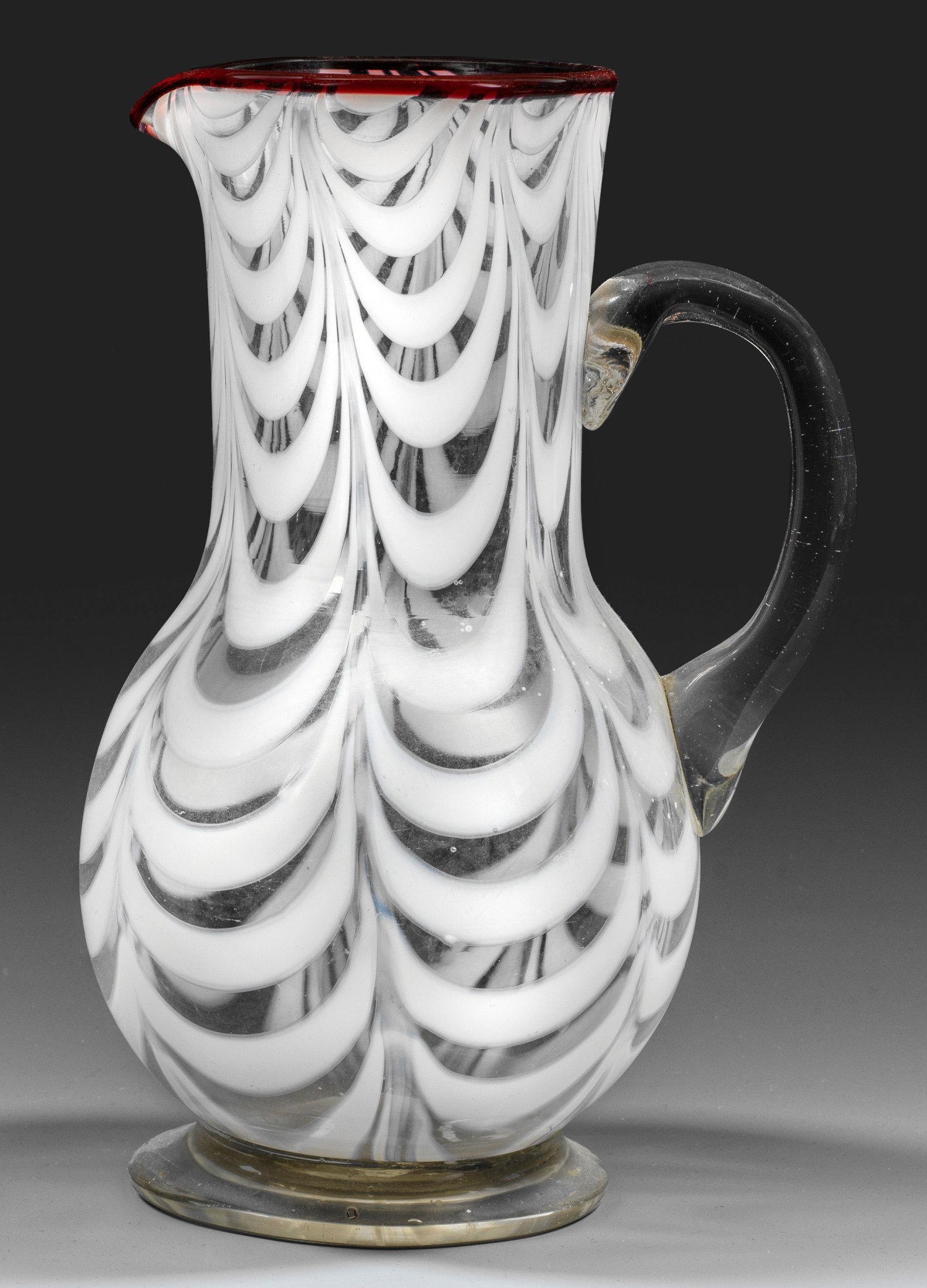 Farbloses Glas mit gekämmtem, weißem Fadendekor und rubinrotem Lippenrand. Ausgestellter Fuß, kugeliger Korpus, Zylinderhals mit kurzer Schaupe, massiver Ohrenhenkel. H. 26,5 cm.