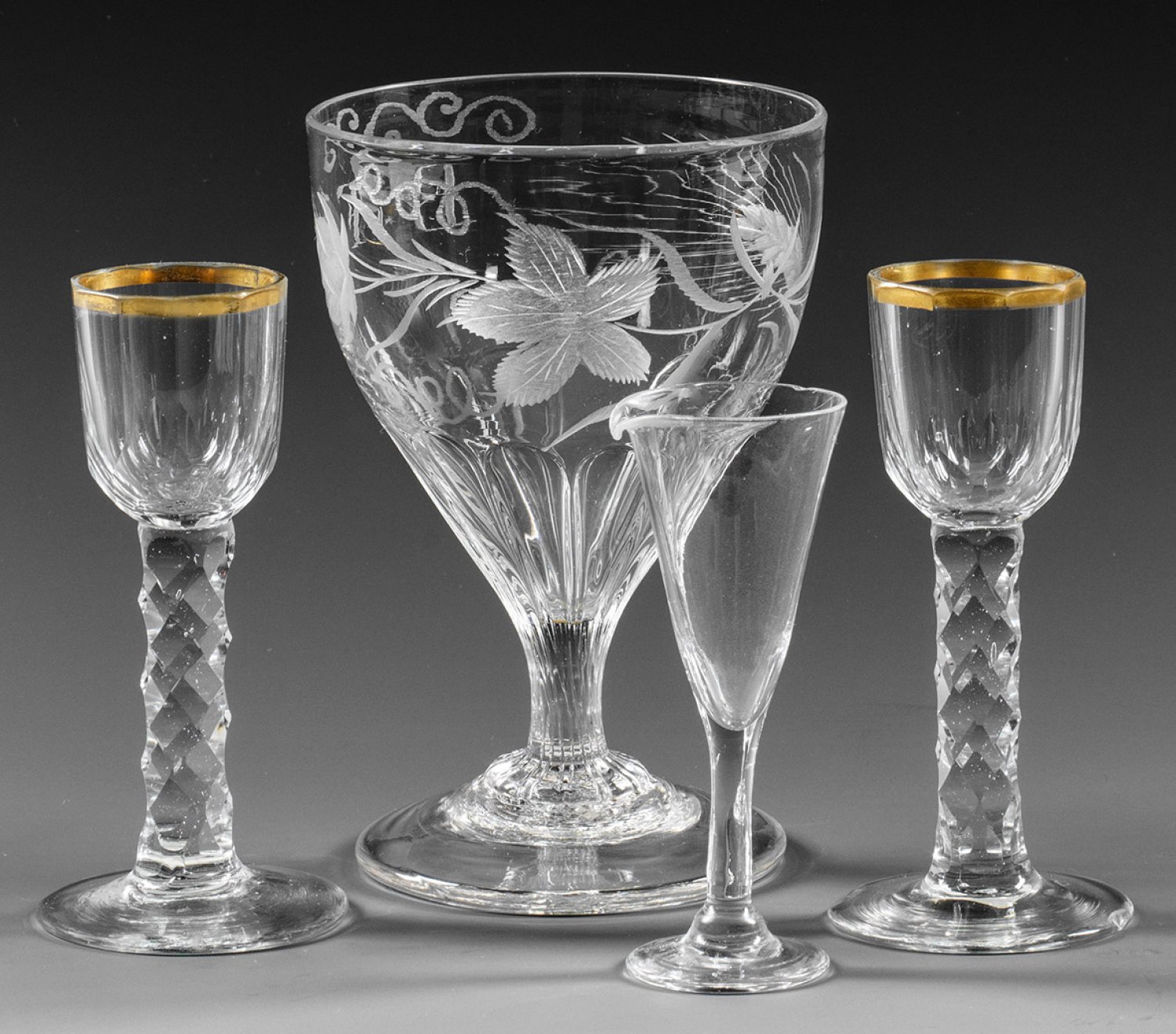 Farbloses Glas, teilw. geschliffen. Eine optisch geblasene Biertulpe mit geschnittenem Hofen- und Gerstendekor sowie Monogramm "BF"; zwei facettierte Likör- oder Schnapsgläser und ein kleines Kelchglas mit kurzem Ausguss. Ein Glas best.; H. 10,5 cm-13 cm.