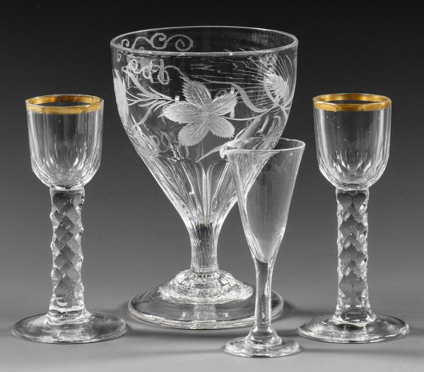A four-piece collection of Gerrman glass objects. One goblet with minor chips.