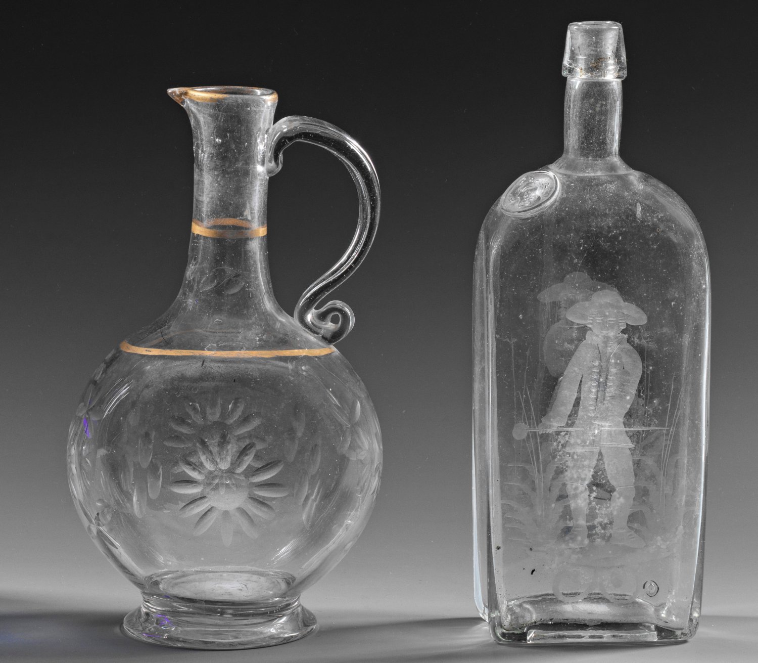 Farbloses Glas. Querrechteckige Schnapsflasche mit geschnittenem Dekor aus Bauer und Bäuerin, aufgelegte Marke mit Wappen und Monogramm "RP"; die Schenkkanne mit rundem, beidseitig abgeplattetem Korpus, Enghals, kurzer Schnaupe, Ohrenhenkel und Schliffdekor, besch.; H. 23 cm-26 cm.