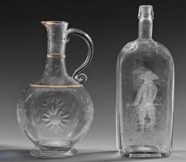 A South German liquor bottle and a Bohemian Baroque glass jug with cut and engraved decor. Flaws to the jug.