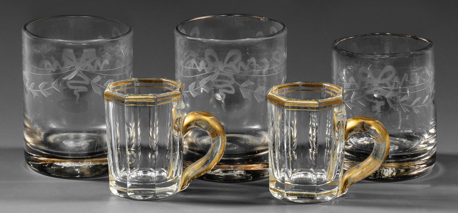 Farbloses und leicht graustichiges Glas. Drei zylindrische Becher mit geschnittenem Festondekor; zwei facettiert geschliffene Henkelbecher mit vergoldetem Henkel und Lippenrand. H. 4,8 cm-6,8 cm.