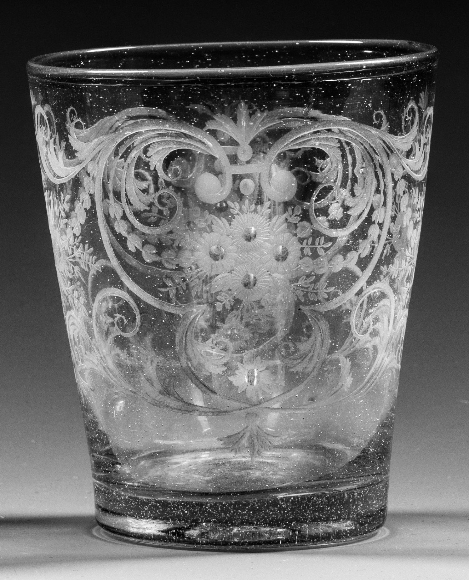 Farbloses, leicht graustichiges Glas. Konische Form. Matt geschnittener Dekor aus Bandel- und Laubwerk sowie Blütenfestons kombiniert mit Blankperlen. H. 10 cm.