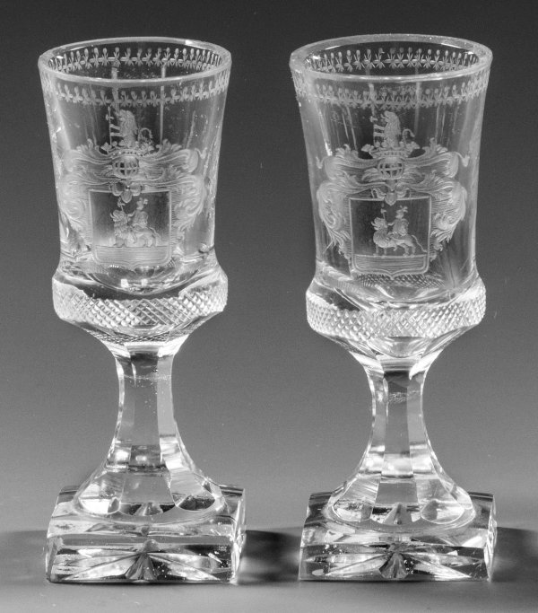 Two North Bohemian or Silesian cut and engraved armorial liquor glasses.