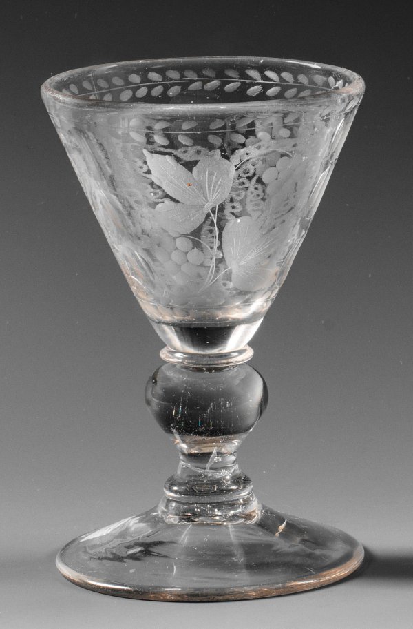 Farbloses Glas. Mittig ansteigender Scheibenfuß, massiver Balusterschaft, konische Kuppa. Flächendeckender Mattschnitt- und Kugelschliffdekor aus großen Weintrauben und -reben, der Lippenrand mit Blattrankenfries. H. 14,2 cm.