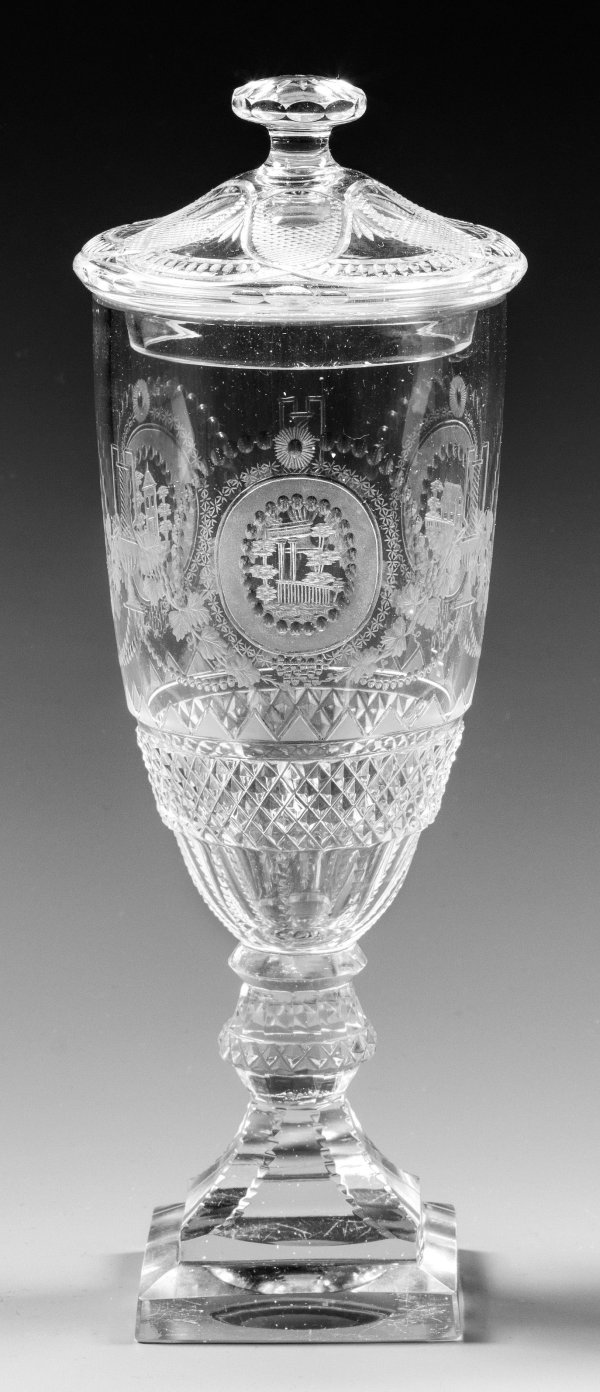 Farbloses Kristallglas, reich geschliffen. Quadratischer Fuß, facettierter und gesteinelter Balusterschaft, spitzovoide, unterhalb korrespondierend gestaltete Kuppa, flacher, glockenförmig ansteigender Deckel mit rundem Knauf. Auf der Kuppa feiner Schnittdekor in Kombination mit Blankperlen aus Ovalmedaillons mit Architekturmotiven, umrahmt bzw. flankiert von Blumenvasen, Weinranken und -trauben sowie Perlengehängen. H. 24,5 cm.