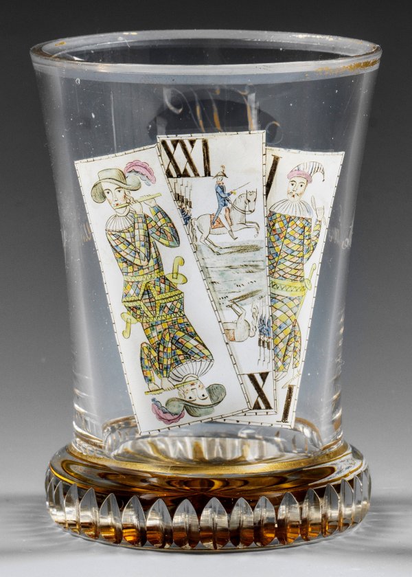 Farbloses Glas. Silbergelb gebeizter Bodenschliffstern, ausgestellter, geschlägelter Ranft, leicht auschwingende Wandung. Schauseitig Dekor in polychromer Emailmalerei aus drei Karten des Tarockspieles, die sogenannten Trull: Sküs, XXI=Mond und I=Pagat. Rücks. Inschrift mit Freundschafts-Widmung in Goldmalerei "G. W. Zum Andenken Am Nahmensfeste d. 24ten Juny 1822 von G. B.". Vergoldeter Lippenrand. Goldmalerei und Lippenrand ger. ber.; H. 11,2 cm.