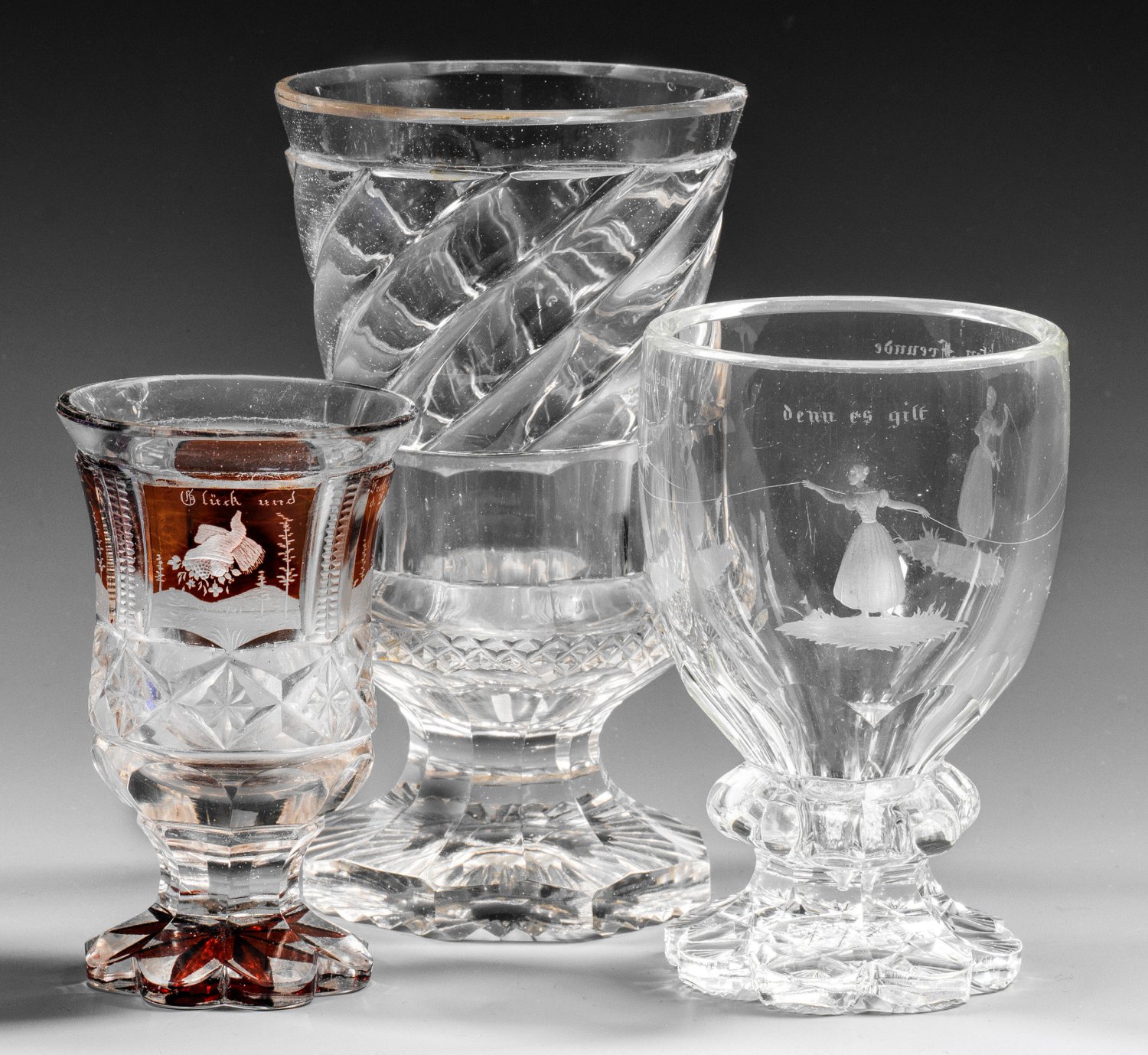 Dickwandiges Kristallglas, partiell reich geschliffen. Ein Freundschaftsglas mit geschnittenem Dekor aus drei Mädchen auf drei einzelnen Landschaftssockeln und von ihnen festgehaltenem, gesponnenem Faden sowie Sinnspruch; ein kleines Freundschaftsglas mit bernsteinfarben gebeizten Feldern und Schnittdekor aus Symbolen und Inschrift. Fußkanten unterseitig ger. best.; H. 11,6 cm-17,3 cm.