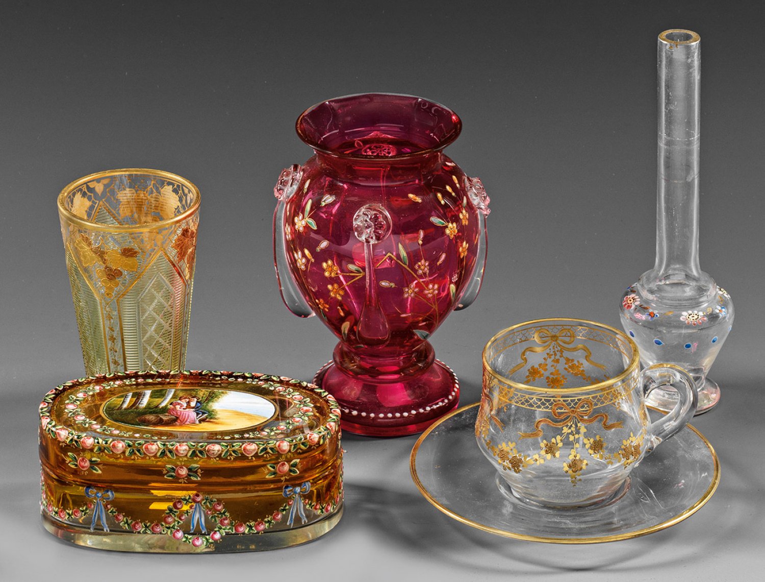 A five-piece collection of German and Bohemian glass objects with cut, enamel and gold decor.