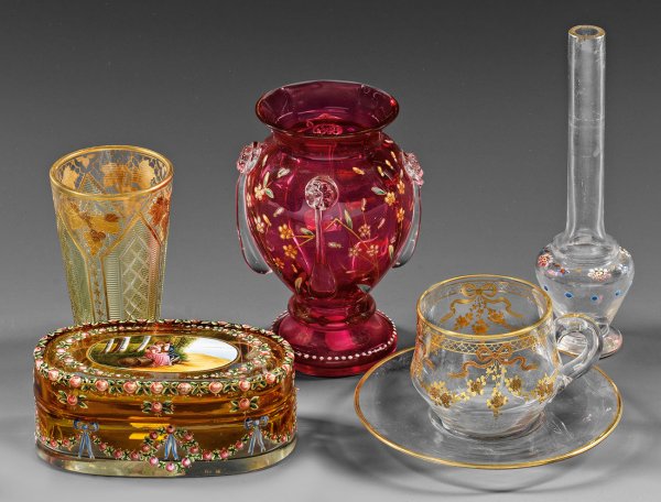 Ziertasse mit Untertasse, zwei Vasen, Zierdose und Becher. Farbloses, teilw. himbeerrot lasiertes und bernsteingelb gebeiztes Glas, verschiedene Schliff-, Gold- und Emaildekore. H. 4,5 cm-16 cm.