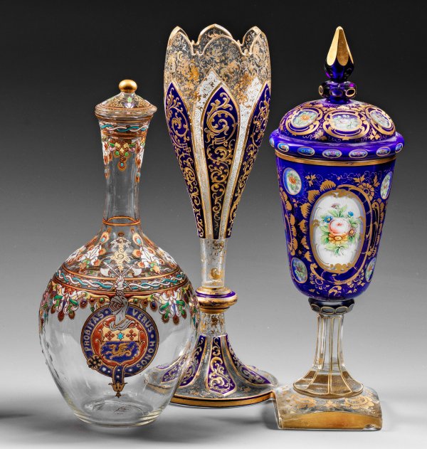 A rare French signed glass decanter with stopper by Jean Philippe Imberton, a Bohemian vase and a goblet and cover. Enamel and gold decor. Chip to foot of the goblet.