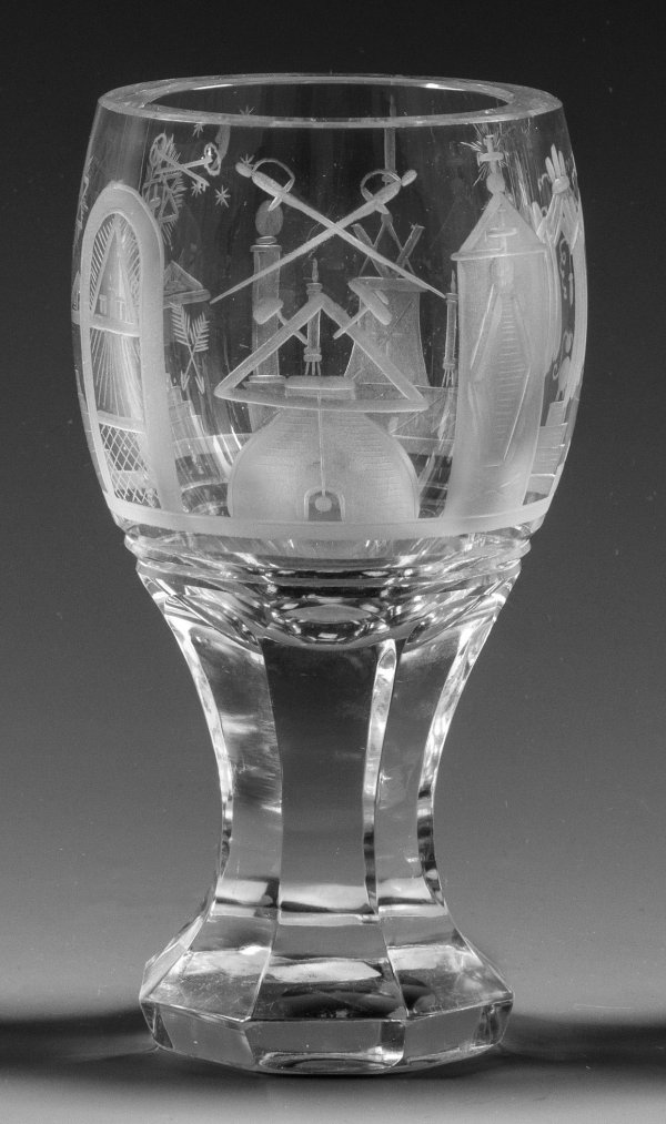 Dickwandiges Bleikristallglas, geschliffen. Geschweifte, römerartige Form. Massiver, achtfach facettierter, geschälter Stand und Schaft mit ausgekugeltem Abriss, die ovoide Kuppa mit umlaufenden, geschnittenen Freimaurersymbolen. H. 15 cm.