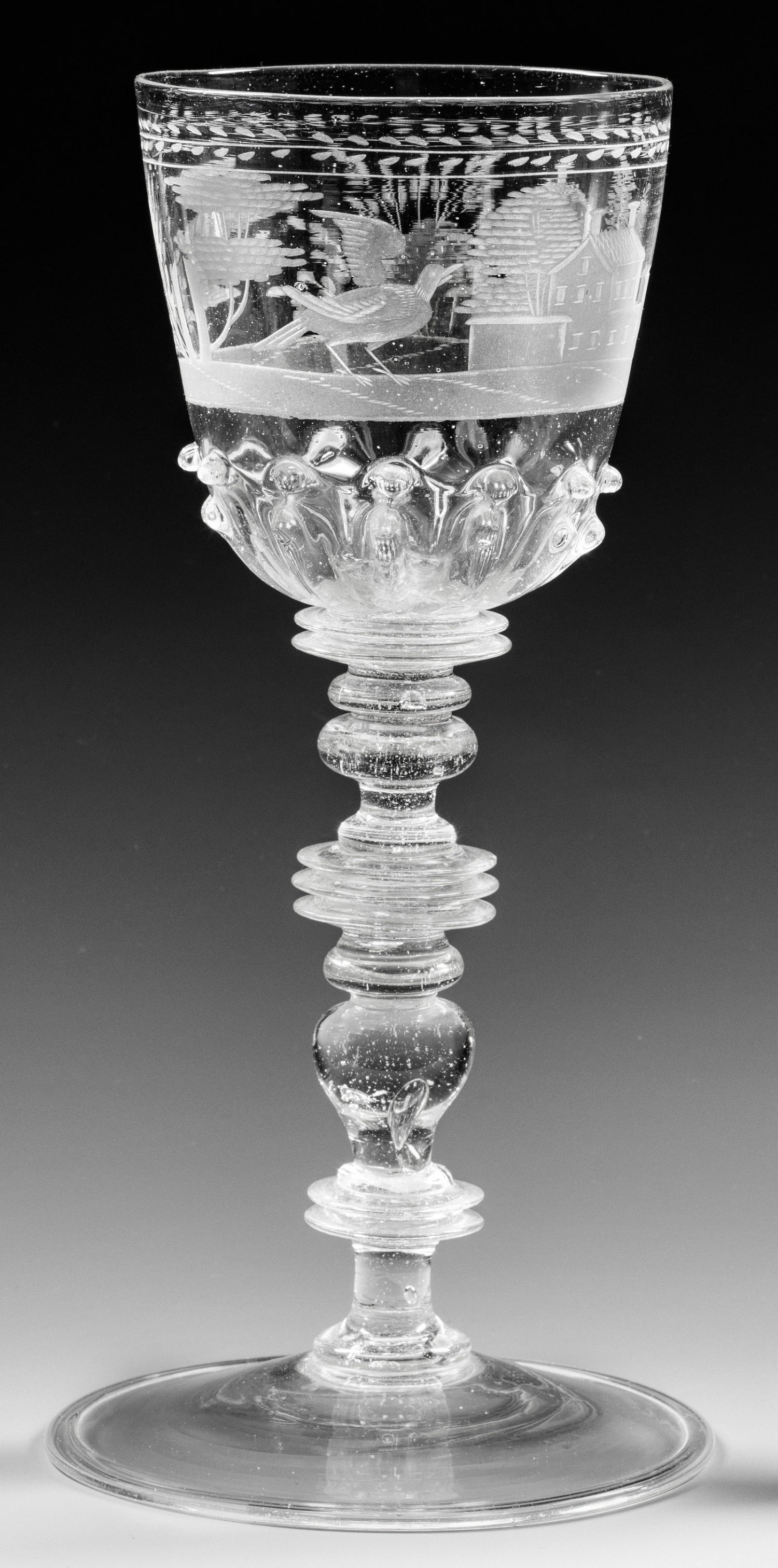 Farbloses Glas. Leicht ansteigender Scheibenfuß, umgeschlagener Rand. Reich gegliederter Hohlbalusterschaft. Konische Kuppa, am gerundeten Ansatz ein aufgeschmolzener Kranz aus aufgeschmolzenen Rippen. Auf der Wandung geschnittener Dekor aus einer umlaufenden Landschaft mit Architekturmotiven und zwei großen Vögeln. H. 26,5 cm.
