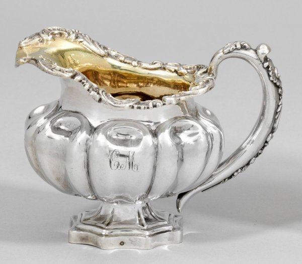 Silber. Über mehrfach eingezogenem Stand ovoider, stark bauchiger und von wulstartigen Zügen umzogener Korpus. Rand und Ohrenhenkel mit reliefplastischen Rocaillen verziert. Schauseitig graviertes Monogramm "C. M.". Innen vergoldet. Gest. 84, Stadtmarke, Beschaumeister Dimitrij Ilitsch Twerskoj, Meister Adolf Sper/Sperr (wird Meister 1829), Jahresmarke. Gew. ca. 270 g. H. 11 cm.