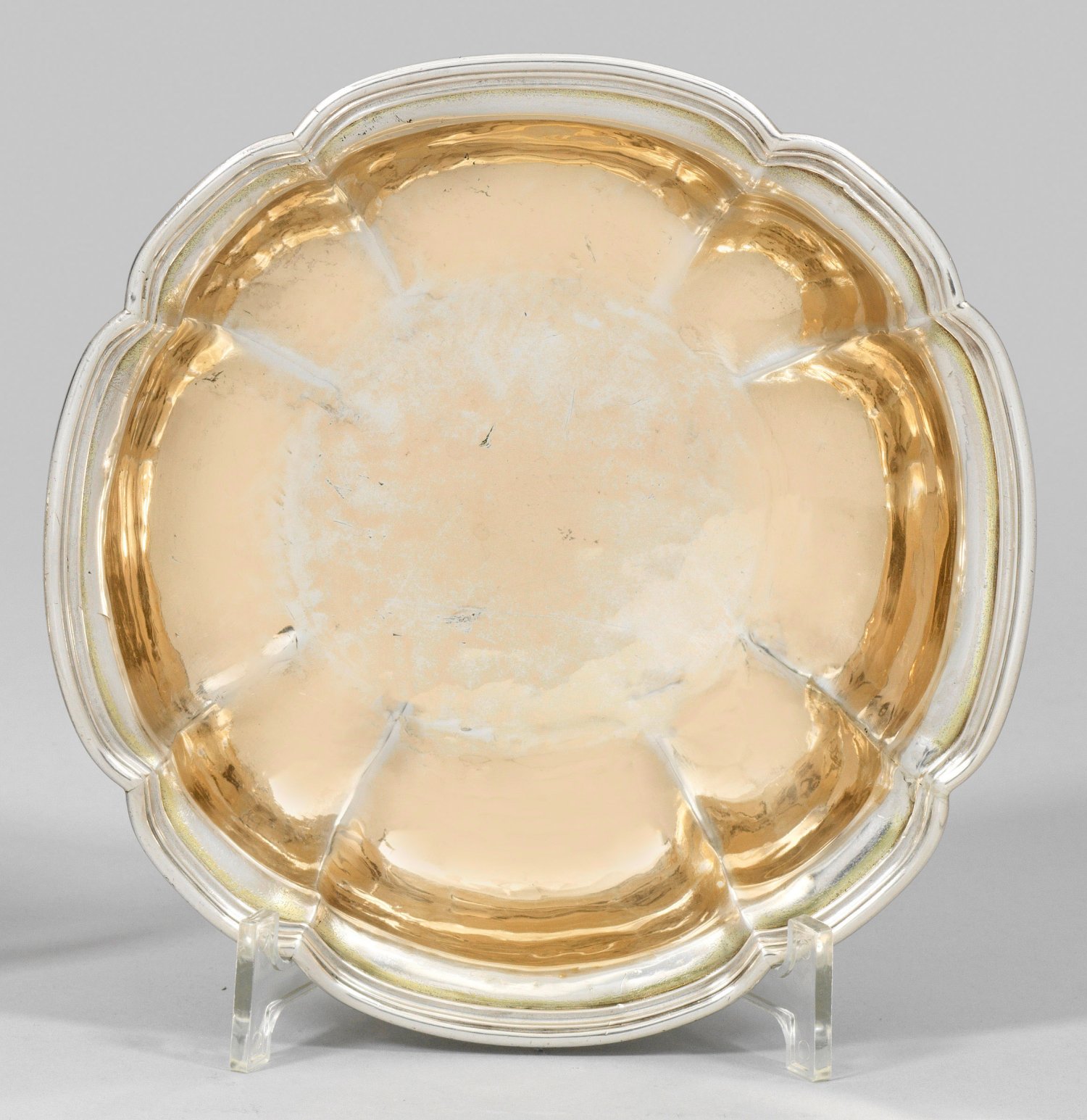 Silber, teilvergoldet. Tief gemuldeter, glatter Spiegel, übergehend in ansteigende, durch vertikale Züge gegliederte Fahne und blütenförmig geschweiften, mehrfach profilierten Rand. Auf der Wandung gravierte, kyrillische Initialien unter Freiherrenkrone. Restauriert. Gest. 84, Beschaumeister Eduard Fedorowitsch Brandenburg, dat., Herstellerzeichen und Hoflieferantenzeichen. Gew. ca. 395 g. D. 20 cm. H. 5,5 cm.