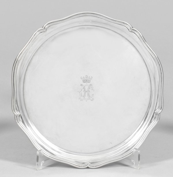 Silber. Über drei halbkugeligen Füßen, gering gemuldeter, glatter Spiegel, übergehend in leicht ansteigende Fahne und blütenförmig geschweiften, profilierten Rand. Zentral graviertes Monogramm "C H" unter Adelskrone. Gest., teilw. verschlagenes Beschauzeichen und undeutliches Meisterzeichen. Gew. ca. 330 g. D. 24 cm.