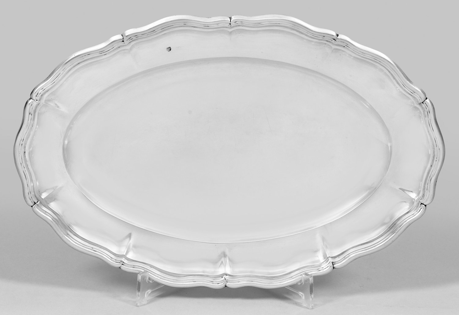 Silber. Oval, in klassischer Chippendaleform. Gering gemuldeter, glatter Spiegel, übergehend in leicht ansteigende Fahne und blütenförmig geschweiften, profilierten Rand. Gest. 13 Lot, Beschauzeichen und undeutliches Meisterzeichen. Gew. ca. 690 g. 37 cm x 24 cm.